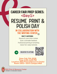 Drop in to the RSO Print and Resource Center (PRC) anytime from 2:00 PM to 4:30 PM for Print & Polish Day, the first part of our two-day Career Fair Prep Series in collaboration with The Writing Center.