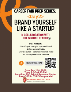 Drop in to the RSO Print and Resource Center (PRC) anytime from 2:00 PM to 4:30 PM for Brand Yourself Like a Startup, the second part of our two-day Career Fair Prep Series in collaboration with The Writing Center.