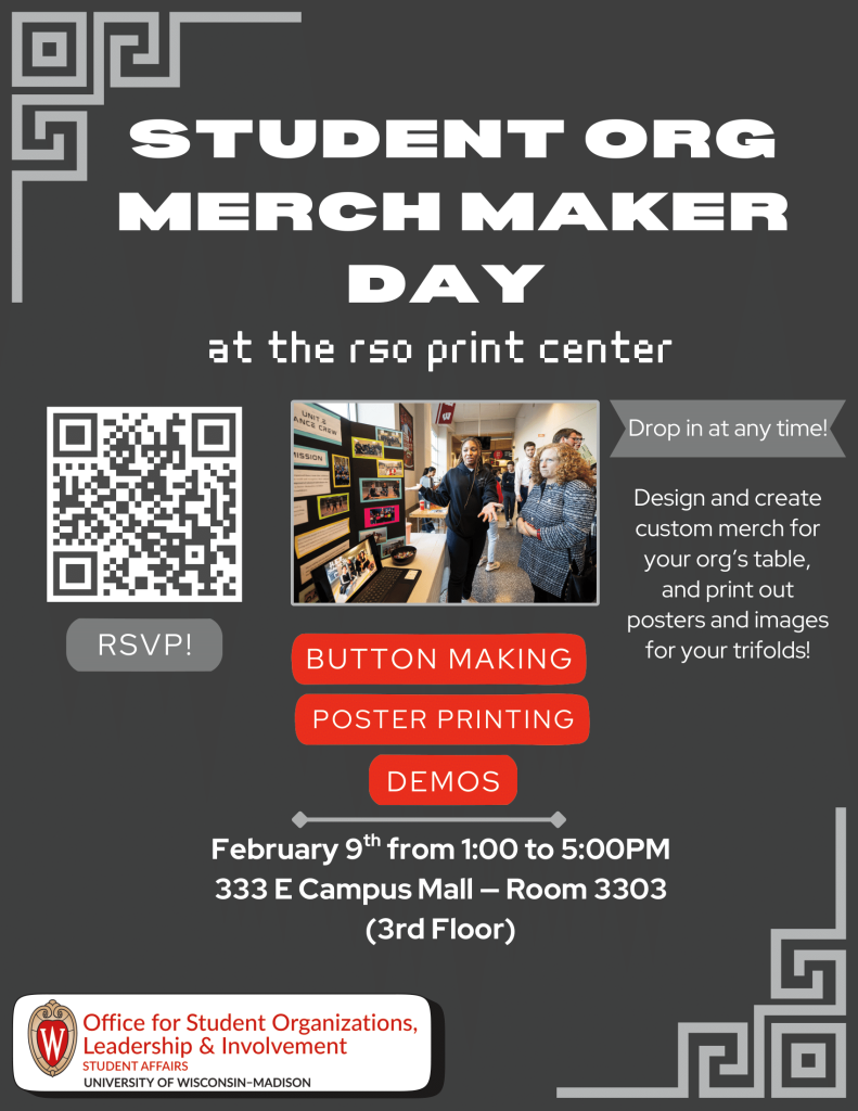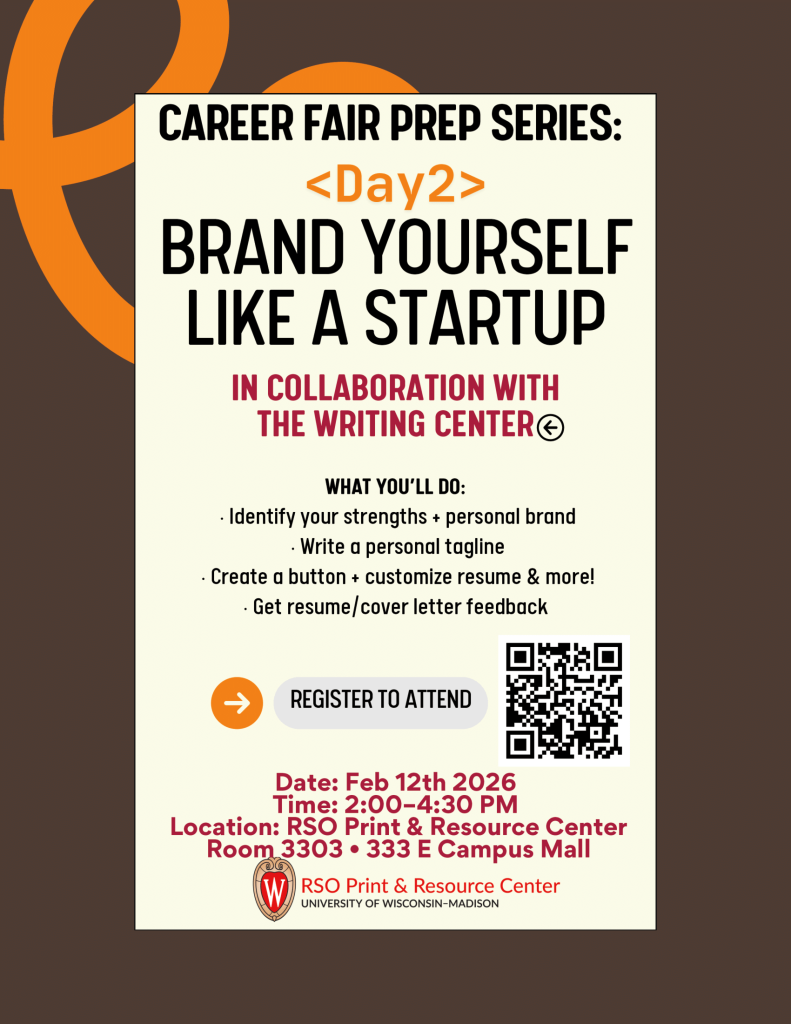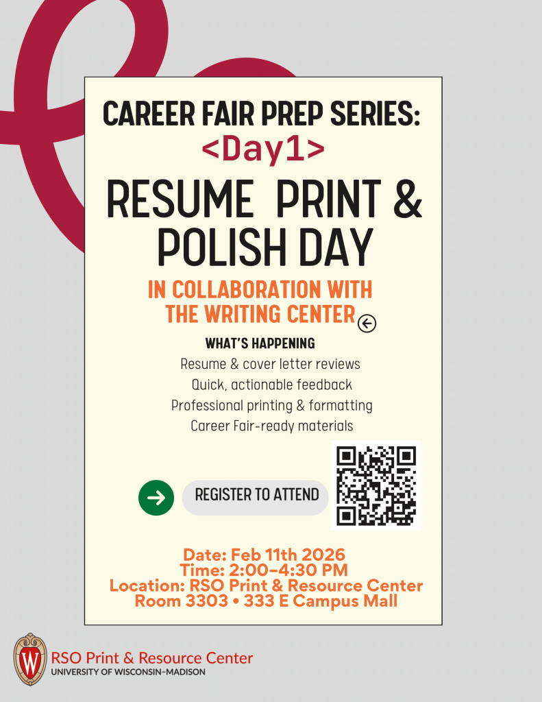 This event will be held in the RSO Print & Resource Center, Room 3303 (333 E Campus Mall, Madison, WI 53715).