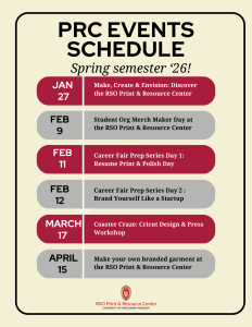 Drop in to the RSO Print and Resource Center (PRC) anytime from 1:00–5:00 PM for Org Merch Maker Day! Student organizations are invited to design a custom merch sample that reflects their brand and supports their spring programming. Whether you’re imagining new tabling materials or testing out a fresh idea, this is your chance to experiment and bring your concepts to life.